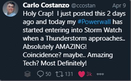 2 days later, a storm rolled in and my PowerWall activated Storm Watch! It was super cool and most likely a coincidence but I was so excited, I fired off another tweet.